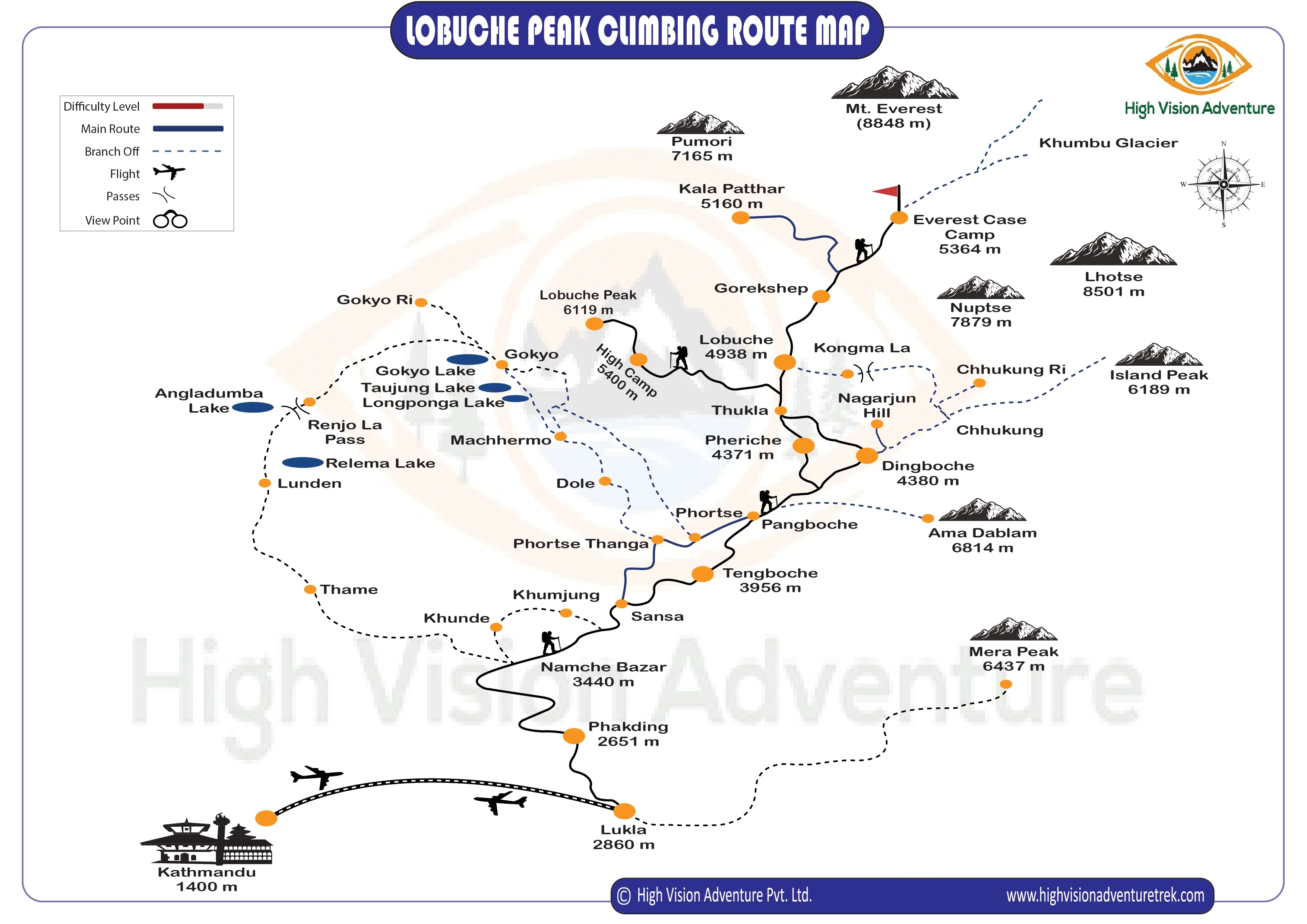 Lobuche East Peak Climbing itinerary begins from Kathmandu with 35 minutes of flying to Lukla. Walking towards Phakding to Namche Bazaar clustered with lodges and hotels, we will go through fascinating scattered villages of Tengboche and Pheriche to make it to the Lobuche base. The route from the high camp begins to be slushier, and we need to cross the rocky slab using the rope. Then the trail goes through the narrow icy ridge, which is technically a challenging part of this expedition. Waving flags at the Lobuche East summit, we will be back to Lukla, and a memorial flight back to Kathmandu ends the calming trip.
