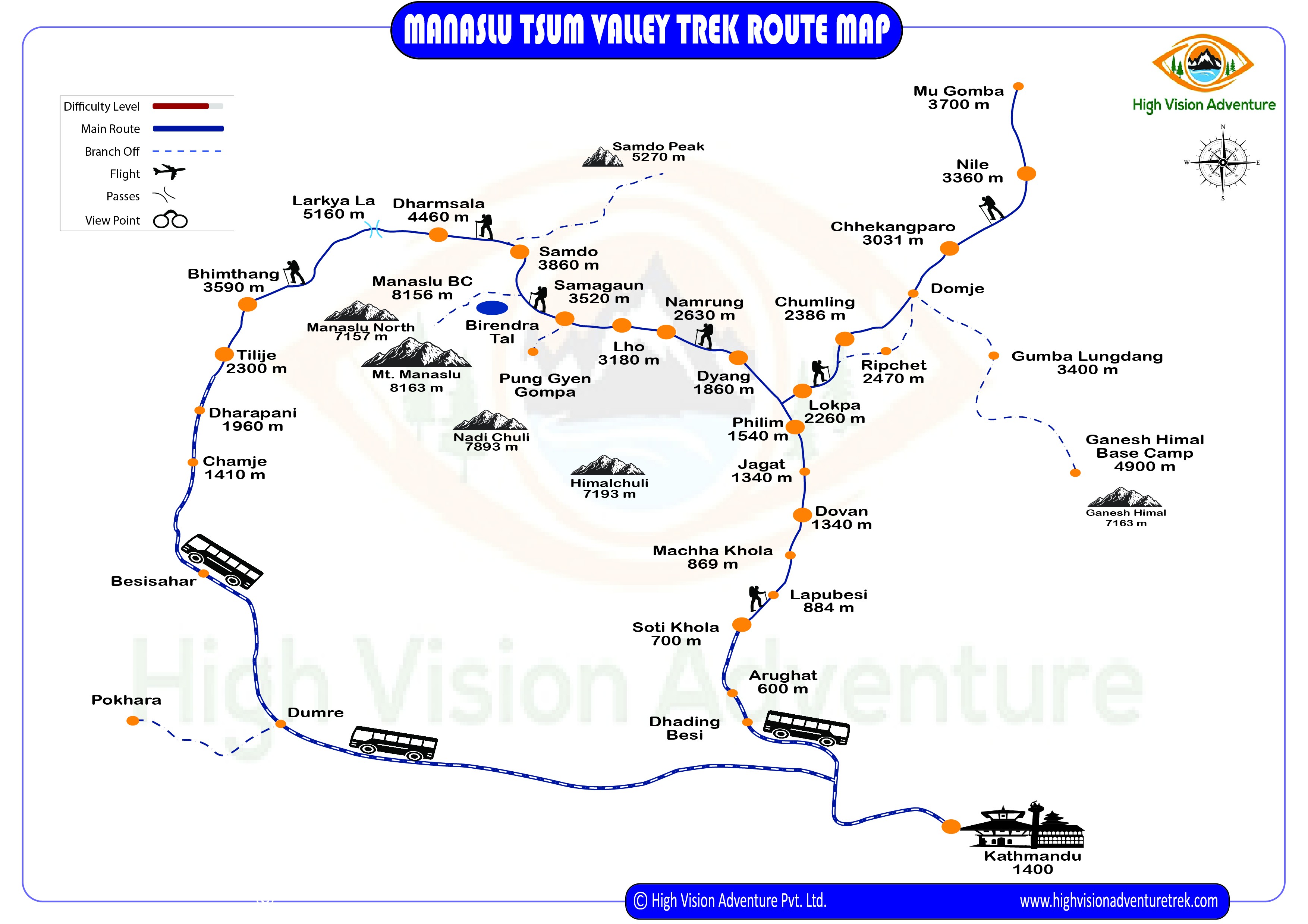 From Lokpa to Ghap to Lho, we pass Gurung and Thakali towns. At Samagaon, we take a rest for one more day and investigate the town. We step by step acquire height from here to Samdo, Dharmasala and cross the Larke La pass at 5200m to arrive at Bhimtang. Leaving for Bimthang the other day. Next, we descend to the Dharapani, moving towards the Ghermu before reaching Besisahar. Finally, we drive from there onwards to Kathmandu by bus, concluding our Manaslu Tsum valley trek.